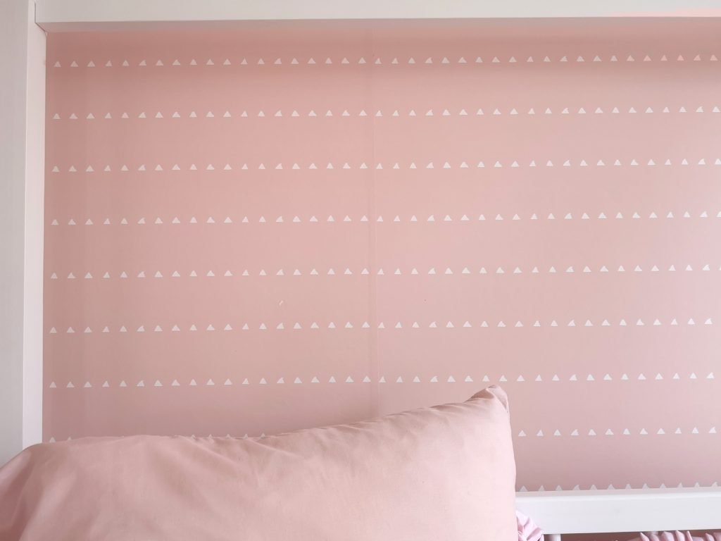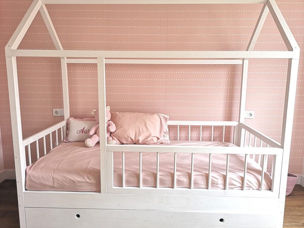 Una de las cosas que más destaca es, sin duda, la cama-casita. Reconozco que a mí me hubiera encantado algo así de pequeña porque convertía cualquier cosa en casita o guarida 😉 Es de Picarazán y además es cama nido, por si tenemos visitas, que seguro serán muchas. Curiosamente, la colcha es la que teníamos en el piso. Y digo curiosamente porque coincide de pleno con el papel de pared que elegimos sin saber que era el mismo tono. El papel de pared, como en las otras habitaciones que os enseñé, es de Motif.