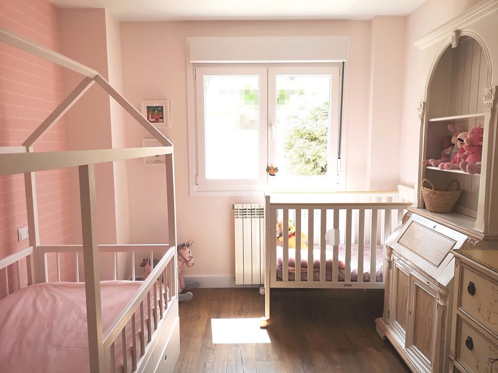Es una de las estancias por las que más me habéis preguntado: la habitación de Aurora. Sin duda, es el espacio de la casa que más lleno se ve, entre otras cosas porque tiene cama y cuna pero ya con la idea de que la cuna esté sólo unos meses más así se verá la habitación más despejada que ahora.También es la zona de la casa que más muebles tiene porque incluí dos de mi infancia, que también estuvieron en nuestro piso. En concreto, el mueble que es escritorio y estantería en una pieza y el armario acristalado. El primero hubo que restaurarlo; a mí me hubiera encantado mantenerlo en blanco pero estaba ya con ciertos golpes, rayones y manchas de usarlo yo de niña y de adolescente, y después por el uso que le dio mi hijo Alfonso estos últimos años. Así que en Punto Retro, un taller de restauración de Gijón, decidieron decapar para disimular las zonas con más imperfecciones.