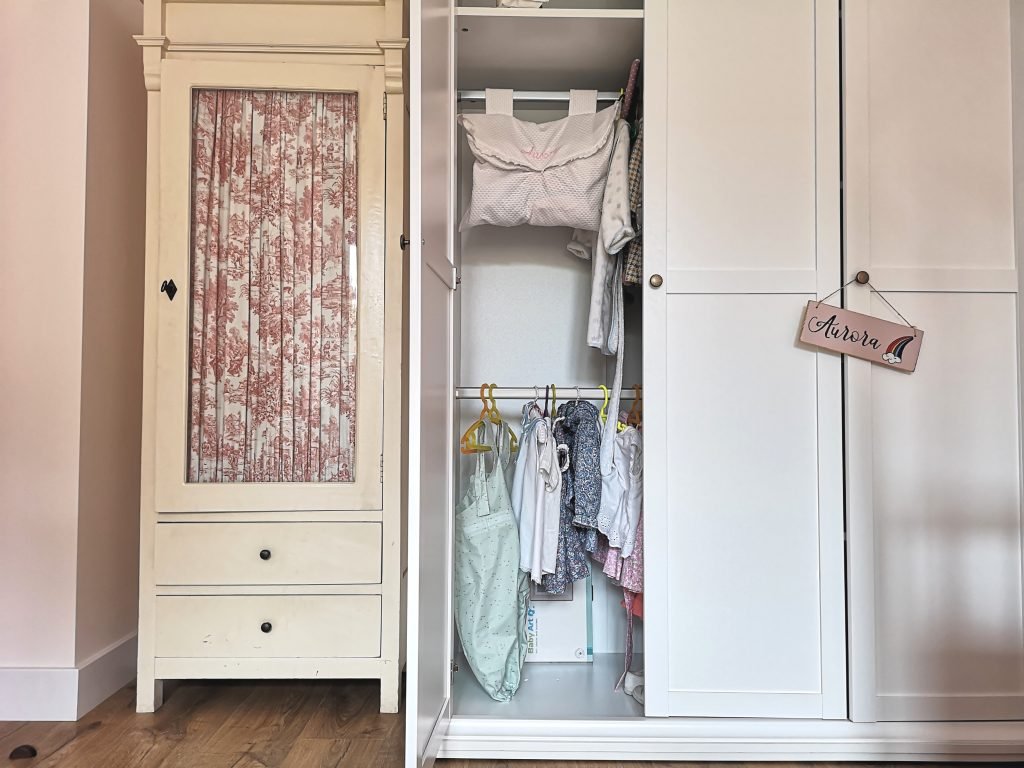 El armario blanco liso ya lo visteis igual en la habitación de Gabriel, es de Jysk. Nos falta la silla pero como aún no va a darle uso al escritorio, y mientras la cuna esté en la habitación ocupando cierto espacio, hemos decidido no ponerla hasta entonces. A su lado hay un armario más estrecho y más bajito, que era de mi infancia también. La cómoda que veis era de casa de mis padres y ahora hace la función de cambiador, le pongo encima una manta que está metida en los cajones junto a toallitas y pañales y listo. Dentro de un año, cuando ya no necesitemos usarla como cambiador, pondremos mi casa de muñecas antigua, la que me hizo mi tío hace 30 años.