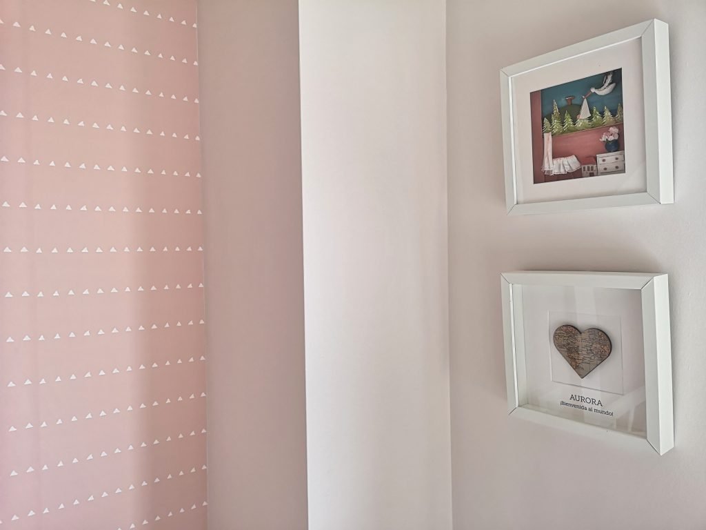La cuna ya tiene 9 años, la usamos con los cuatro niños y es de la marca Trama. El balancín es de Tutete. Y el suelo es de Quick-Step, en este post tenéis toda la información. Los cuadros de la pared son de Lindatiti (acuarela con el nombre de Aurora), Regalador (el del corazón) y de mi tía Gracia (el que recrea una habitación infantil).
